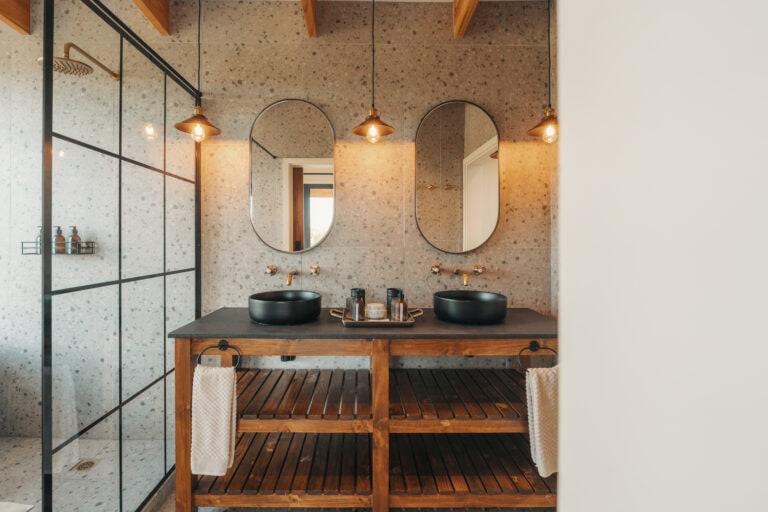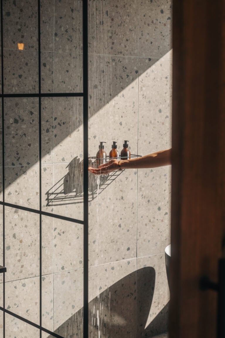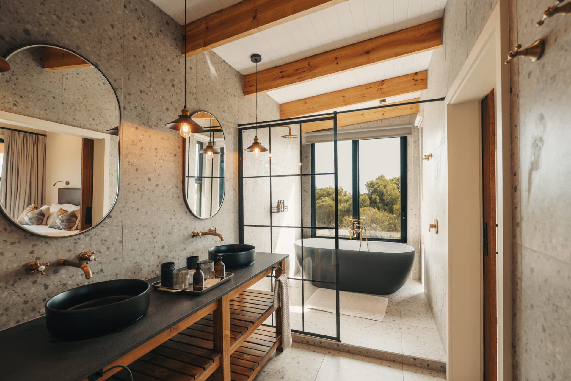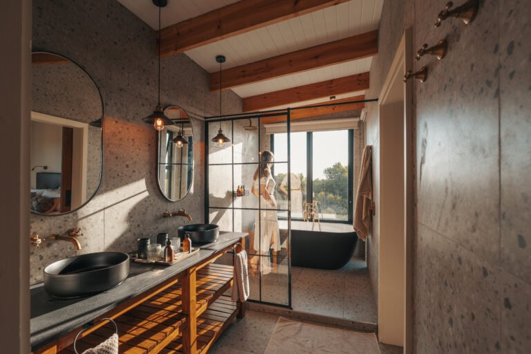Each bathroom is a showstopper, complete with double vanities, brass accents and a spacious wet area with a walk-in shower and freestanding bath set beneath the window. Fijn bath amenities are provided, and the toilet is separate for privacy.