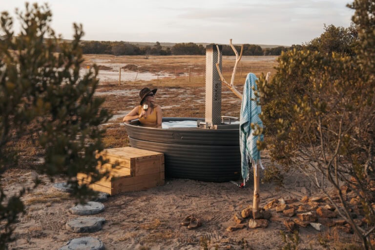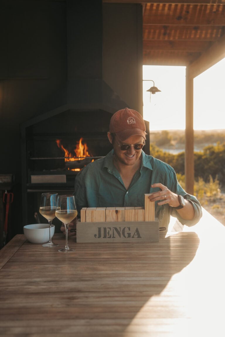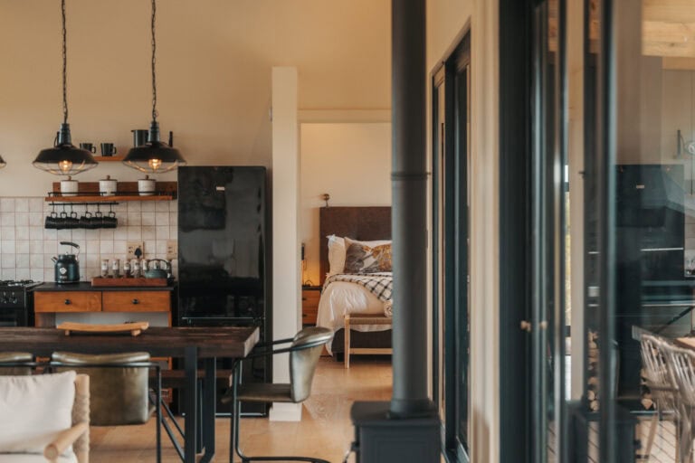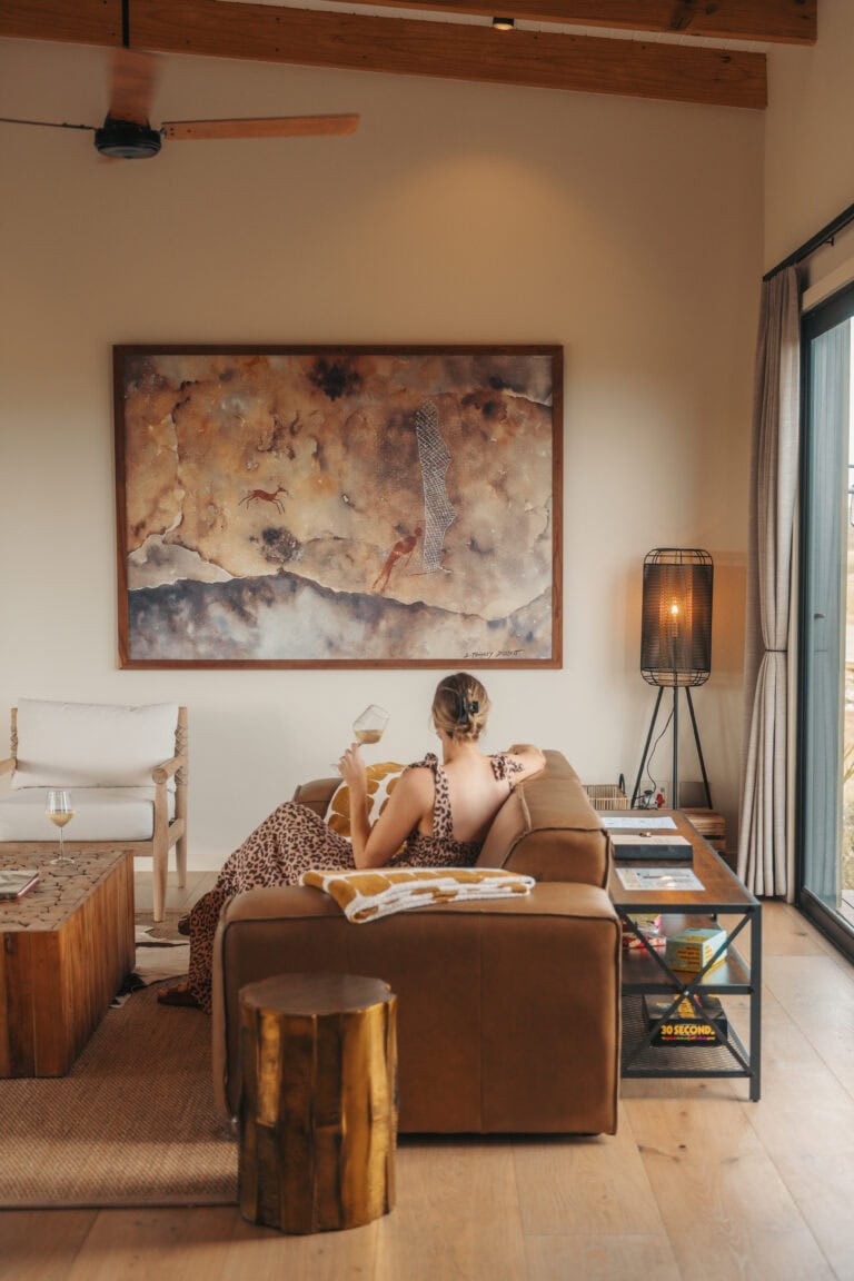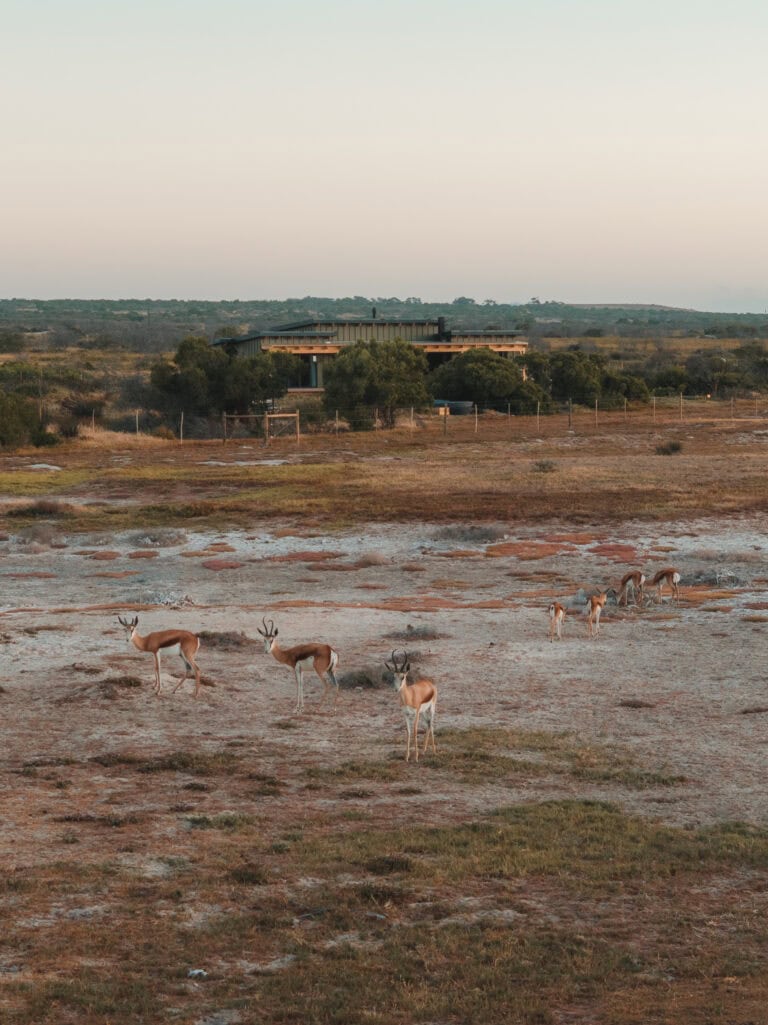 The layout of this cabin is ideal for a four-sleeper. It’s super spacious, with mirror-imaged bedrooms and bathrooms on either side of the cabin, and each bathroom has its own bath! We also loved all the thoughtful local touches throughout the space, especially the fynbos tea tasting. But the real highlight for us was enjoying sundowners around the fire pit while buck and giraffe wandered across the salt pans – it really felt like we were back in the bush!