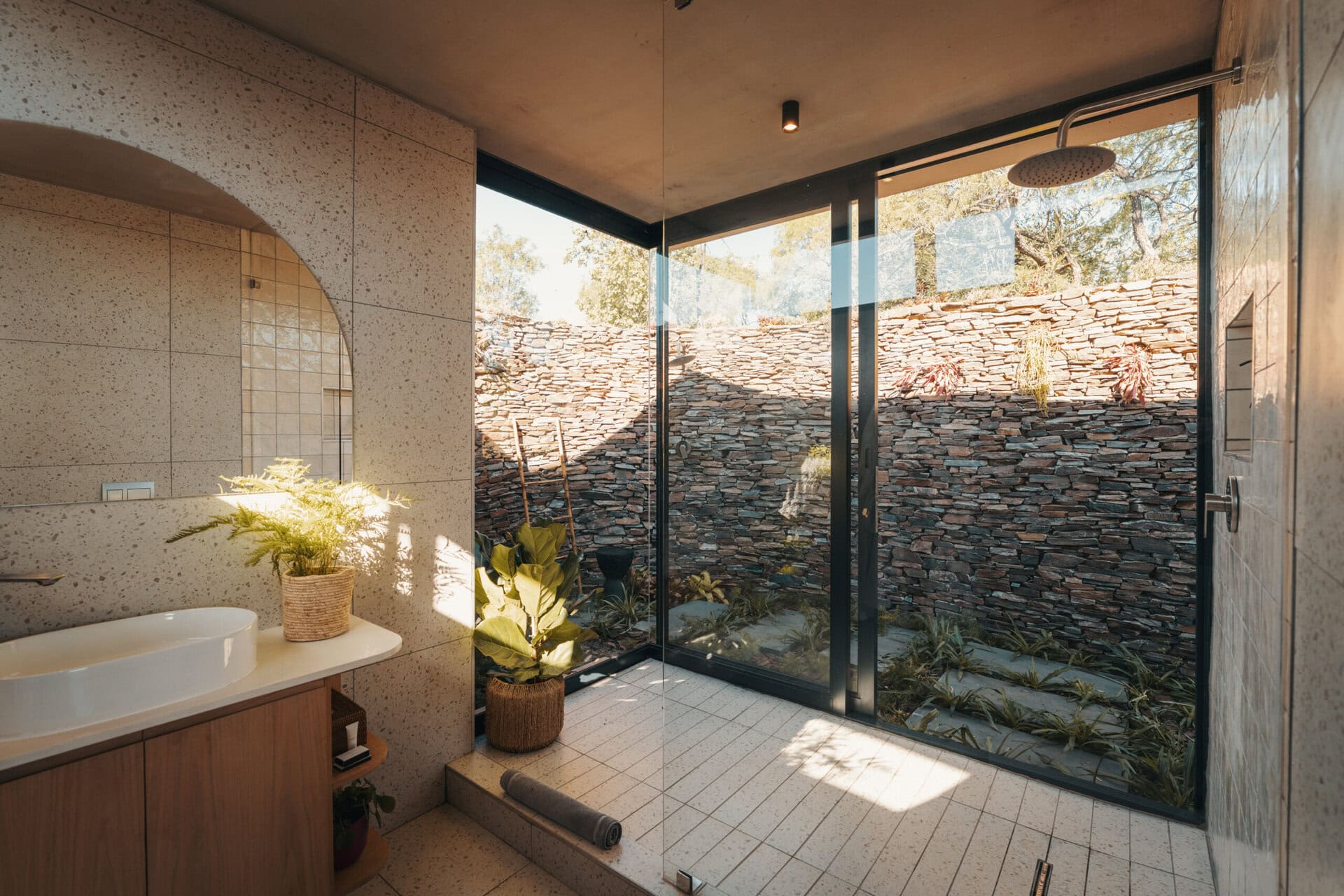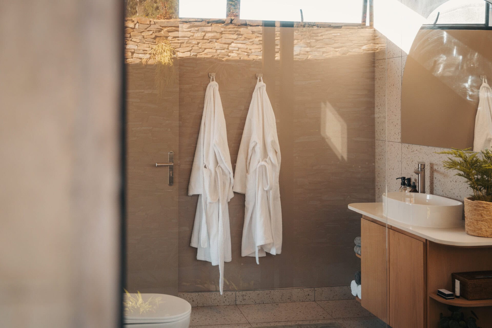 The spacious bathroom features a large indoor shower, and there’s also an outdoor garden shower surrounded by succulents. Charlotte Rhys amenities and gowns are provided.
