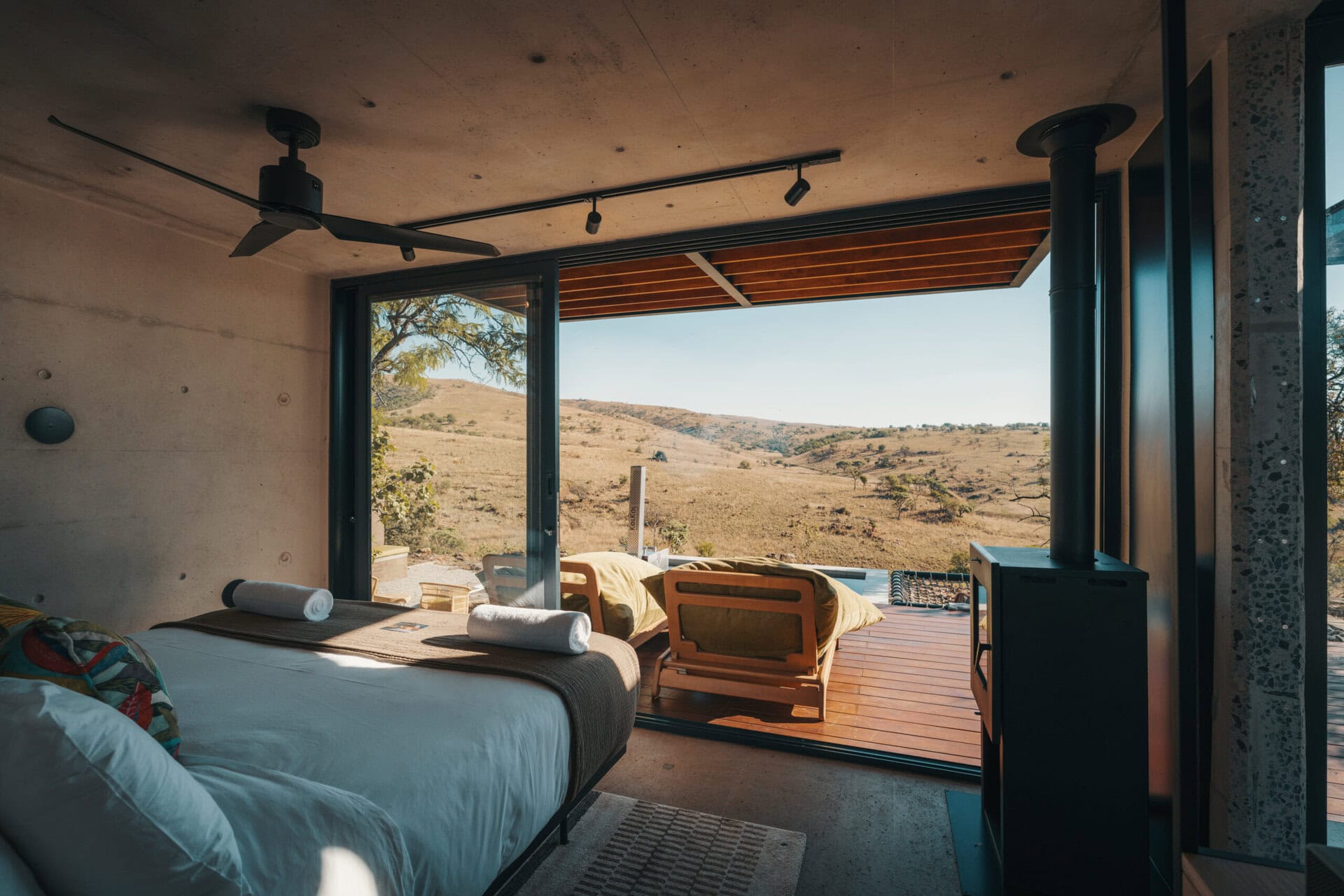 The bedroom opens onto the deck, allowing you to throw the doors wide open and take in the breathtaking views right from your bed. The king-sized bed features luxurious linen, extra blankets for winter, and even a fireplace to keep things cozy. There’s also a clothes rail with drawers for storage, and a fan to keep you cool during the summer months.