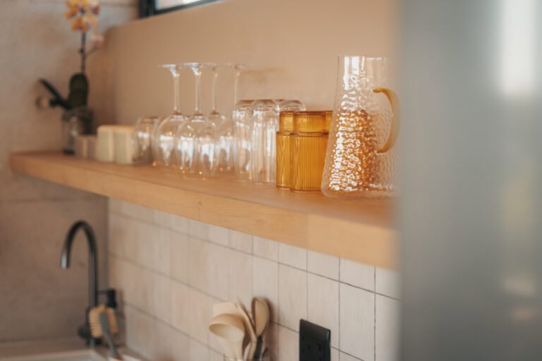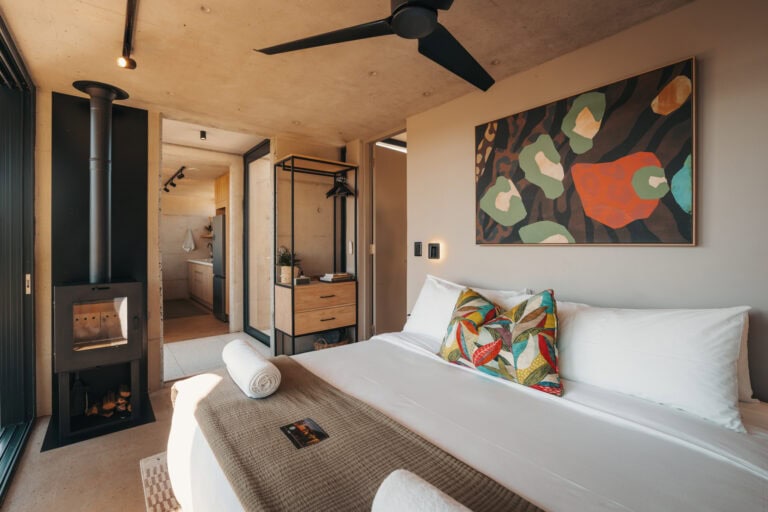 The bedroom opens onto the deck, allowing you to throw the doors wide open and take in the breathtaking views right from your bed. The king-sized bed features luxurious linen, extra blankets for winter, and even a fireplace to keep things cozy. There’s also a clothes rail with drawers for storage, and a fan to keep you cool during the summer months.