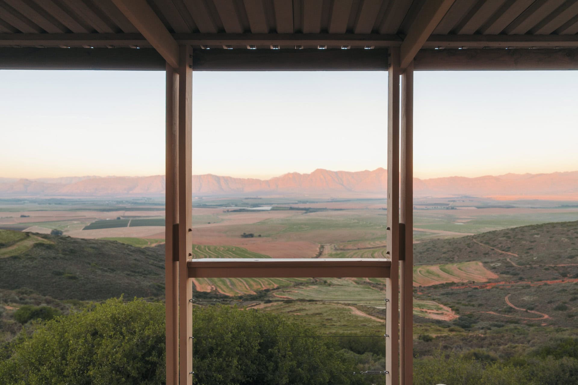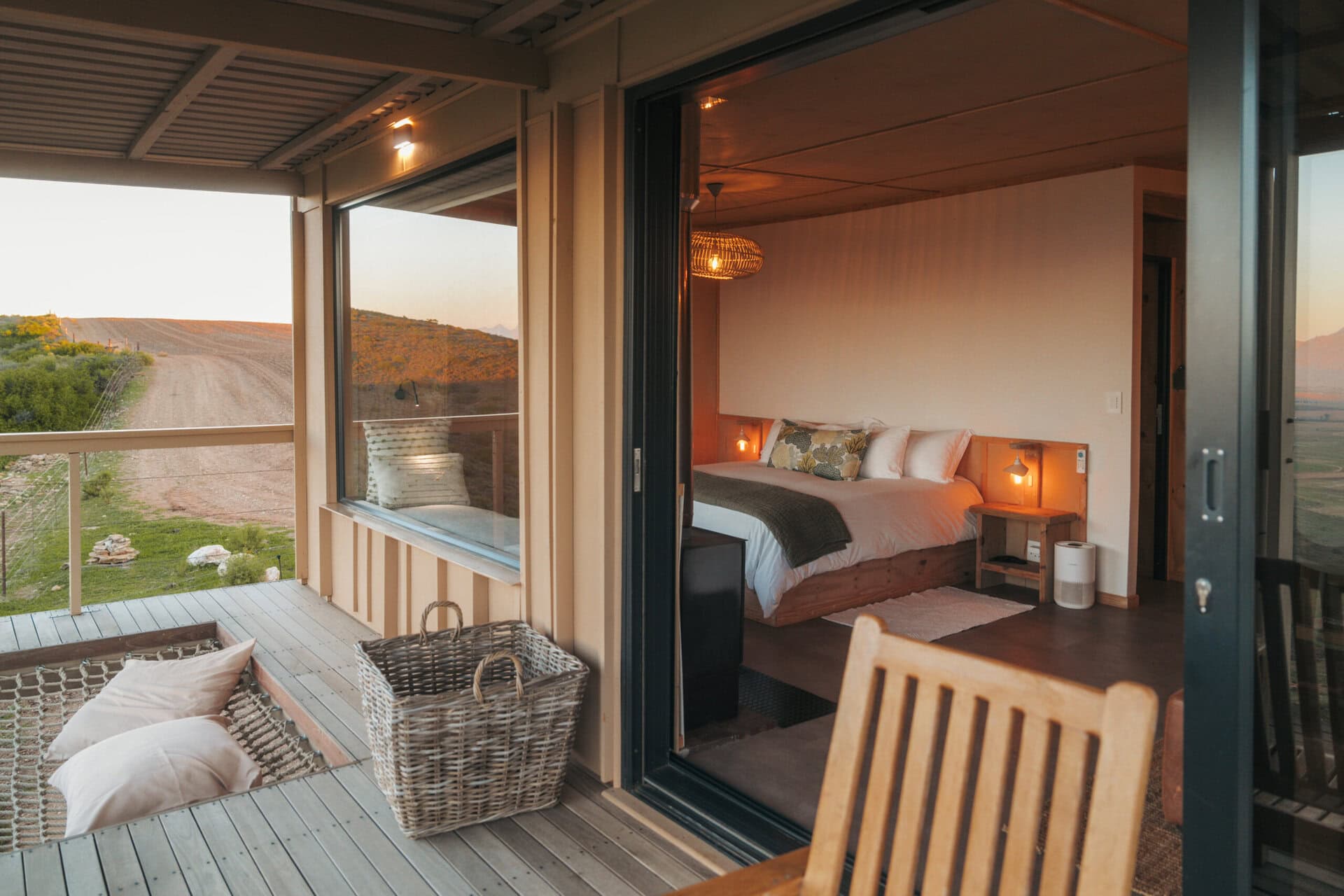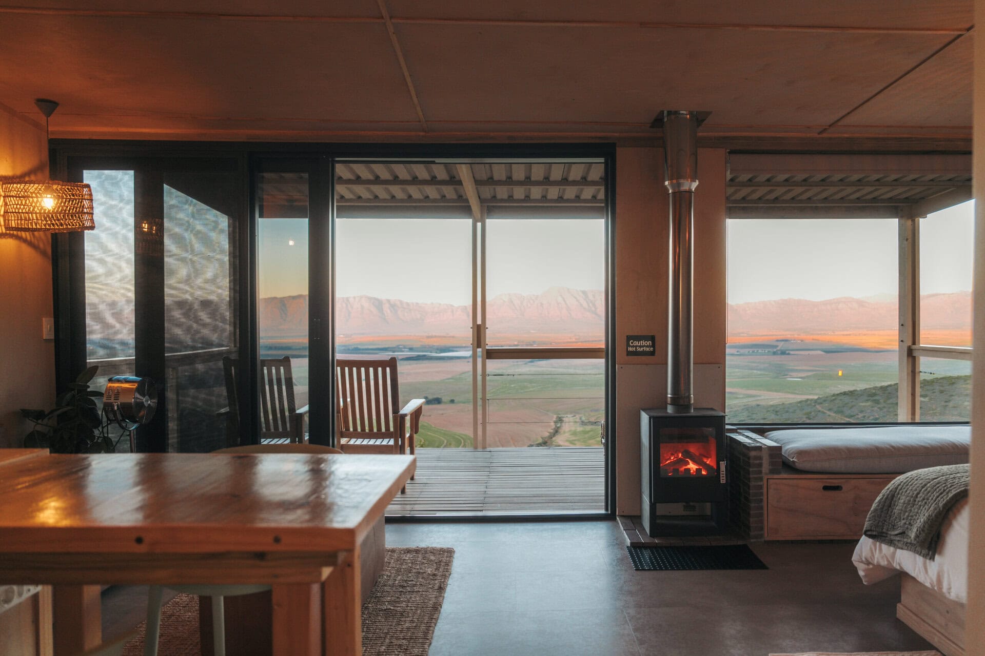 The outdoor deck comes with two deck chairs and a cargo net to enjoy the sweeping valley views. Out front, there’s a wood-fired hot tub and braai area overlooking the canola and wheat fields.