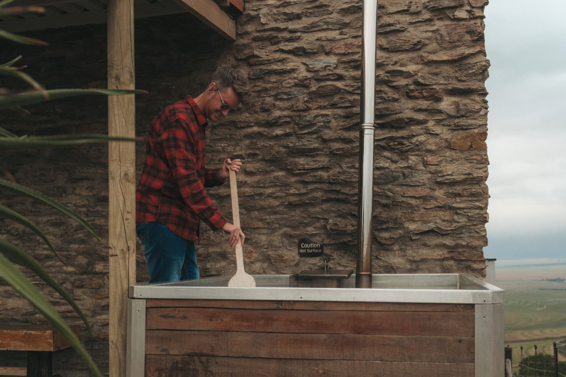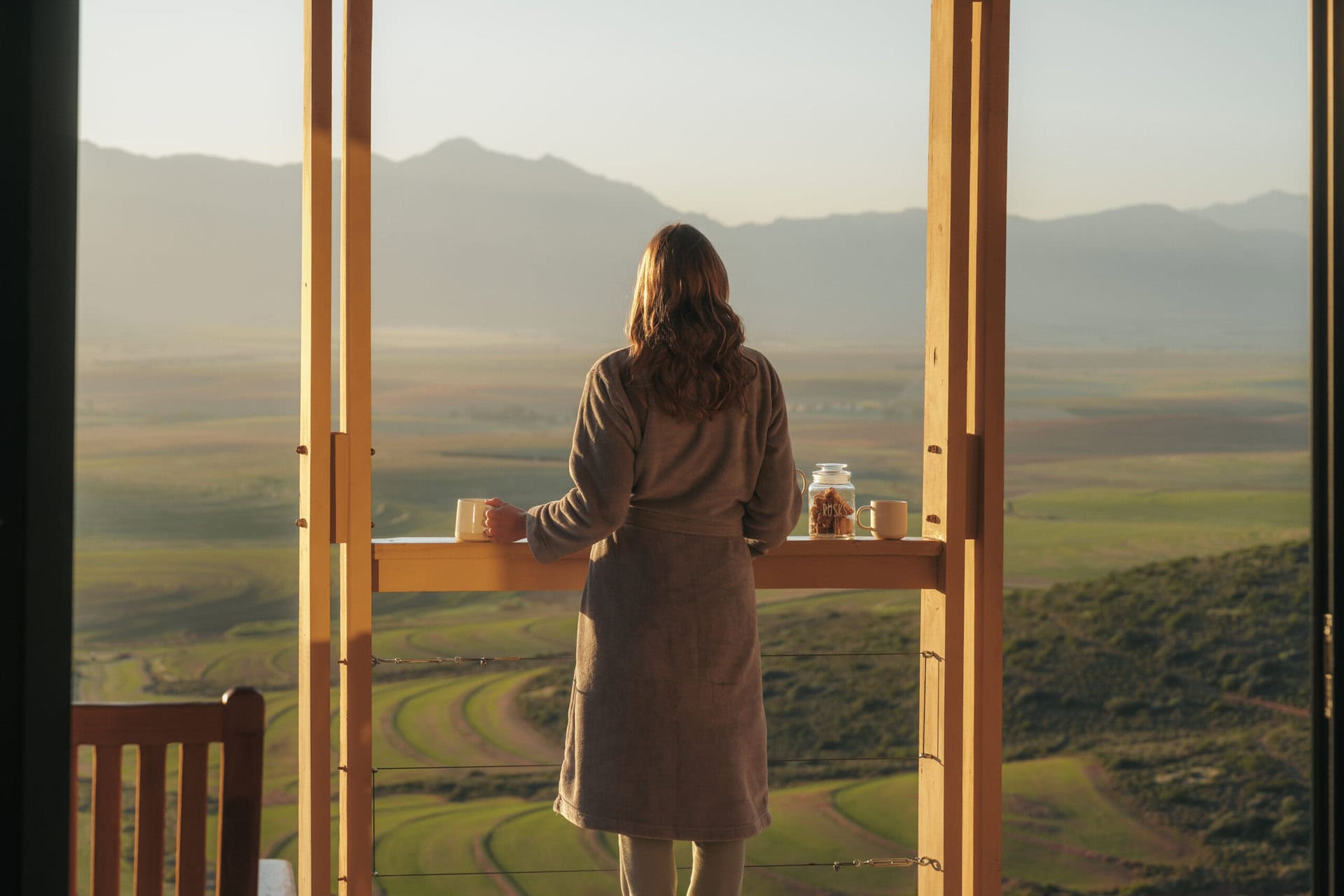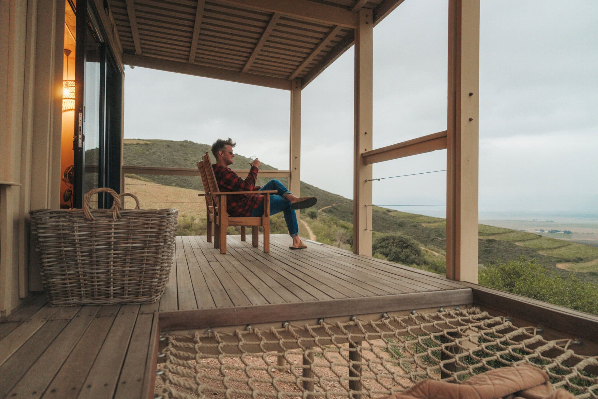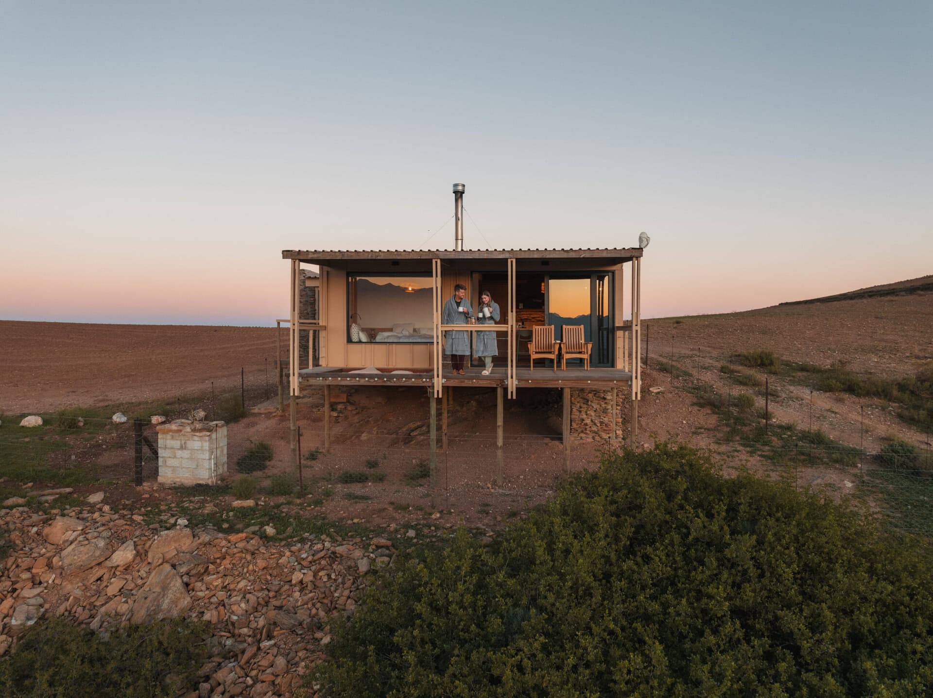 The outdoor deck comes with two deck chairs and a cargo net to enjoy the sweeping valley views. Out front, there’s a wood-fired hot tub and braai area overlooking the canola and wheat fields.