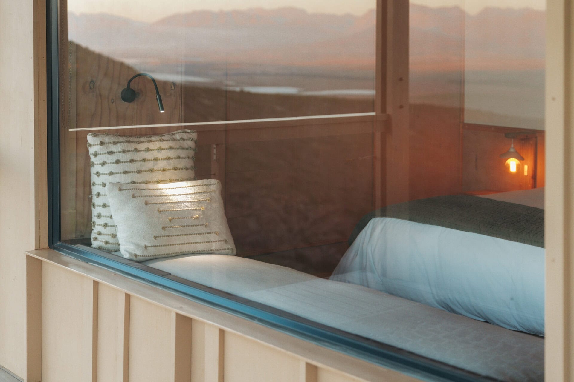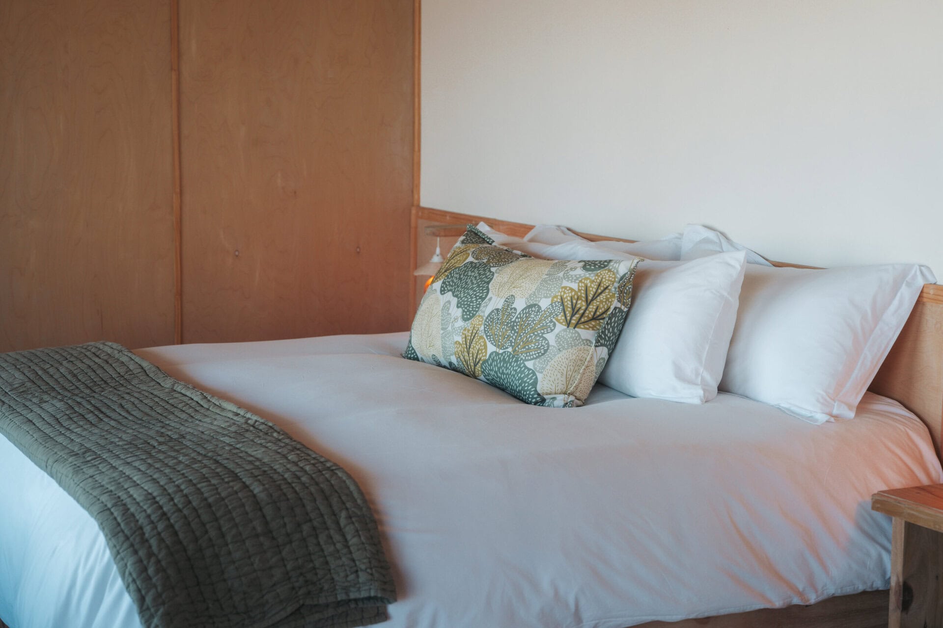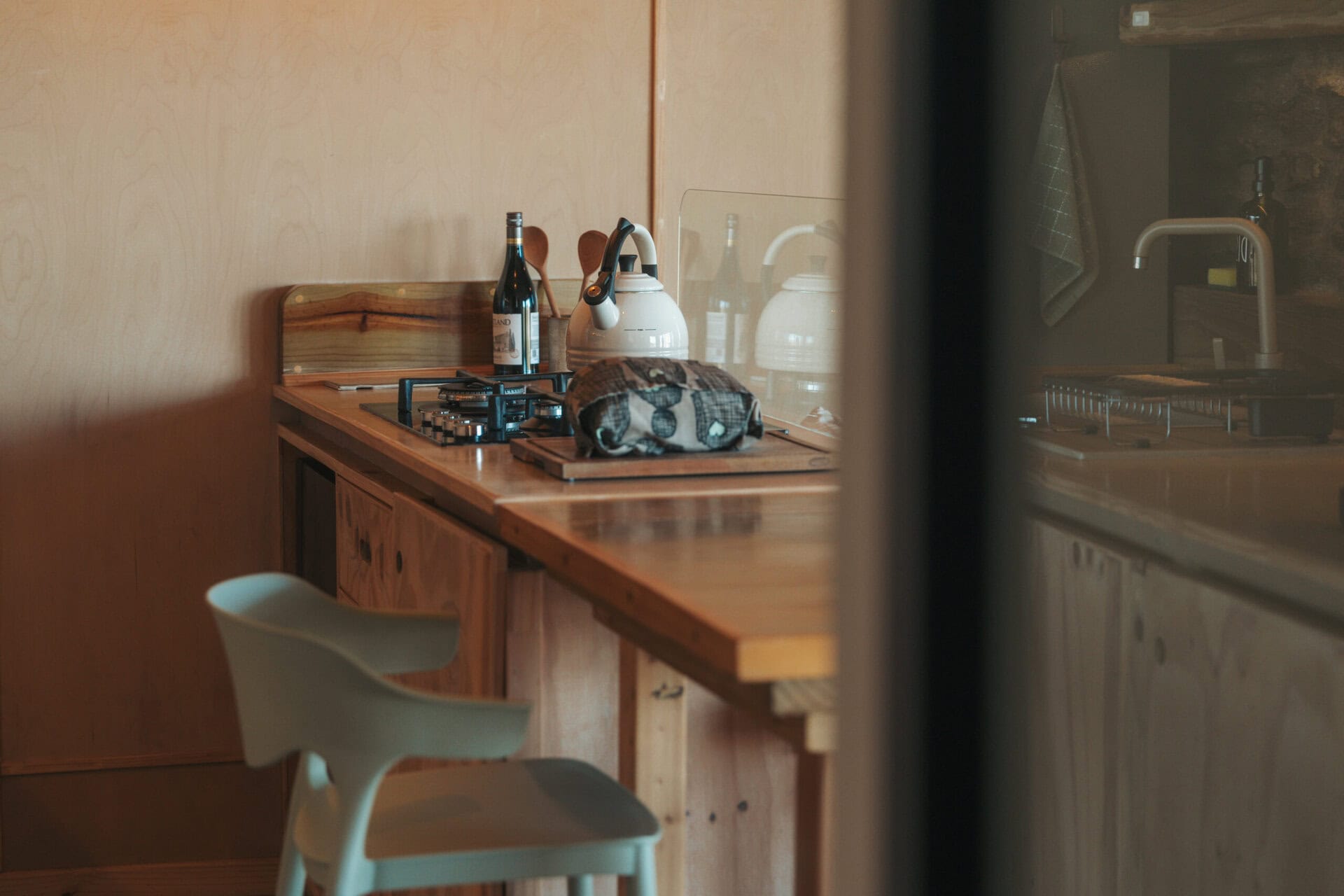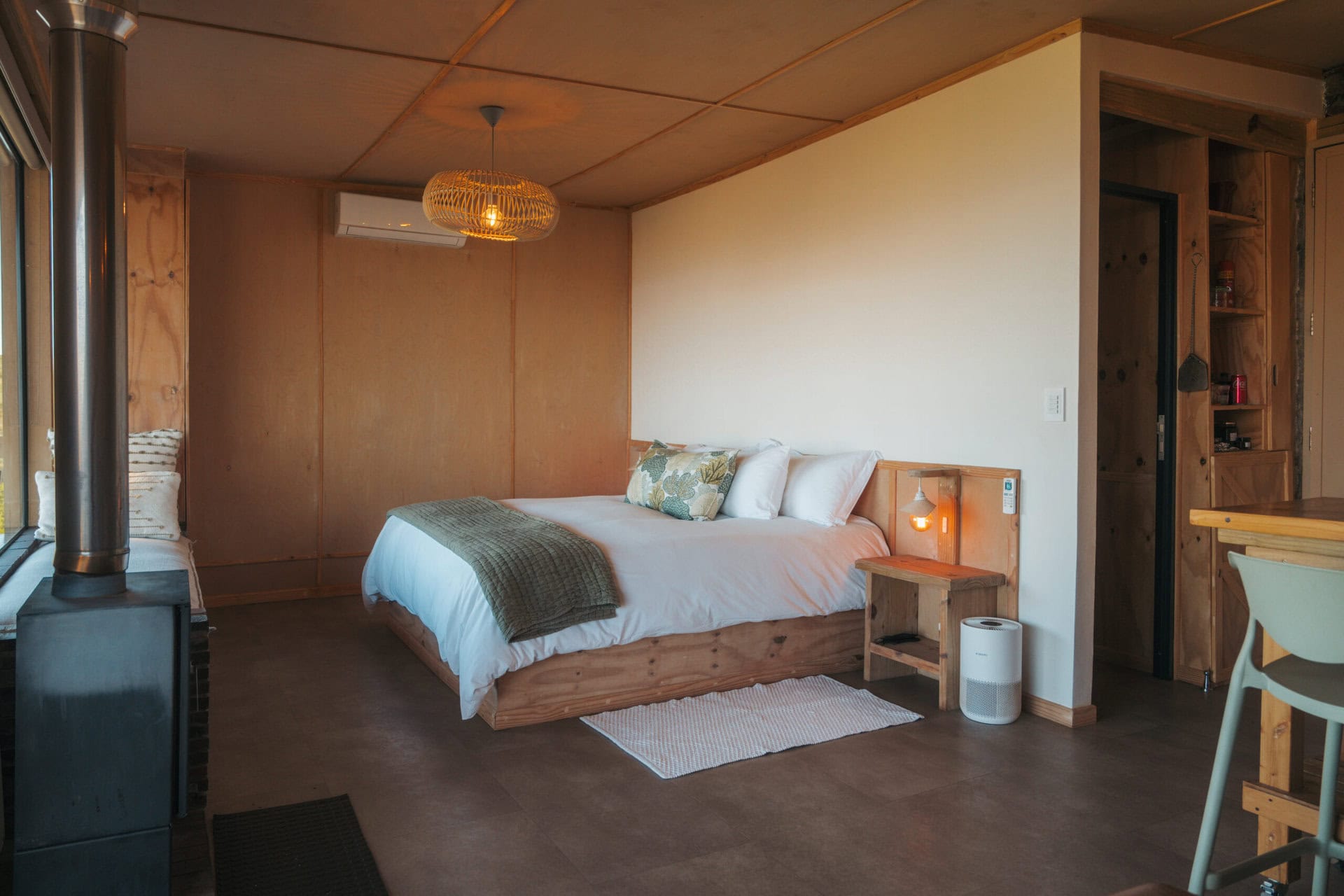 The bedroom opens out onto the deck and boasts stunning valley views, along with a comfy window nook, perfect for curling up with a book and a coffee. The king-sized bed features luxurious linen and extra blankets for winter, while an aircon keeps things cool on hot summer nights. There’s also a cupboard for storage.
