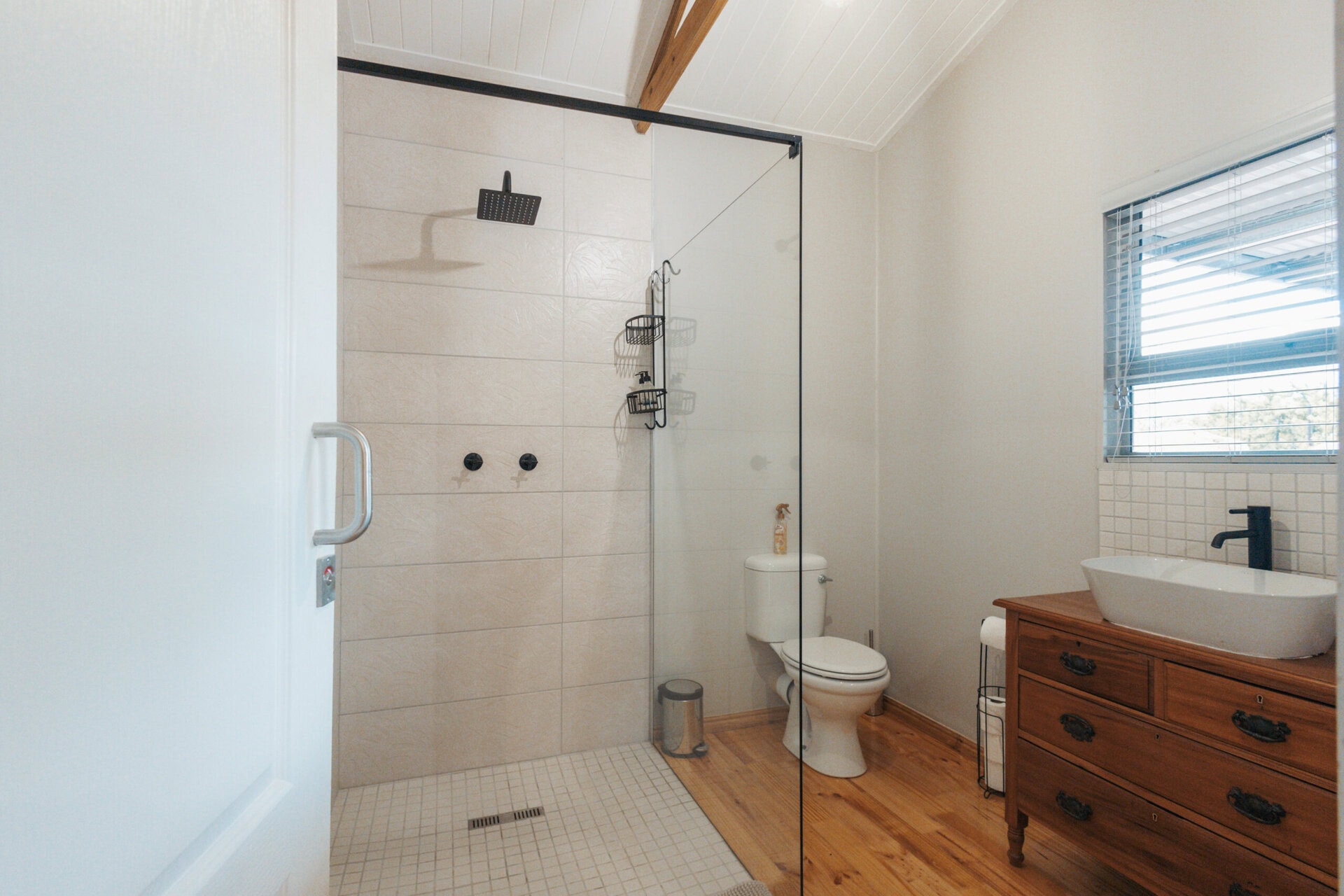 The bathroom features a large shower. There is also an outdoor shower and bath just outside the bedroom which is surrounded by pine trees and birds chirping!