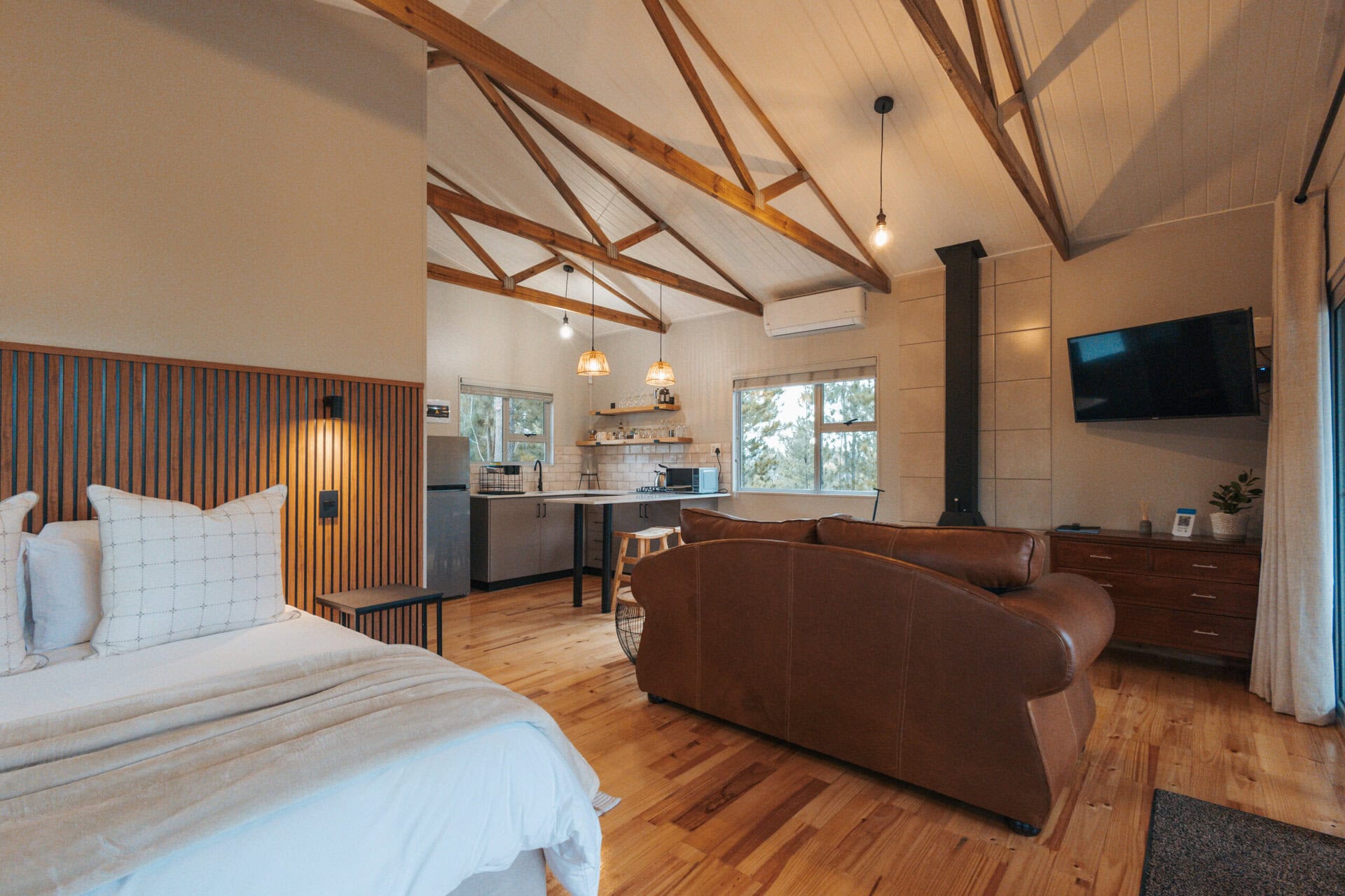 There’s a large leather couch positioned in front of the fireplace with a flat screen TV. You can choose to dine indoors at the kitchen counter or outdoors on the wooden deck. There is also an aircon for summer.