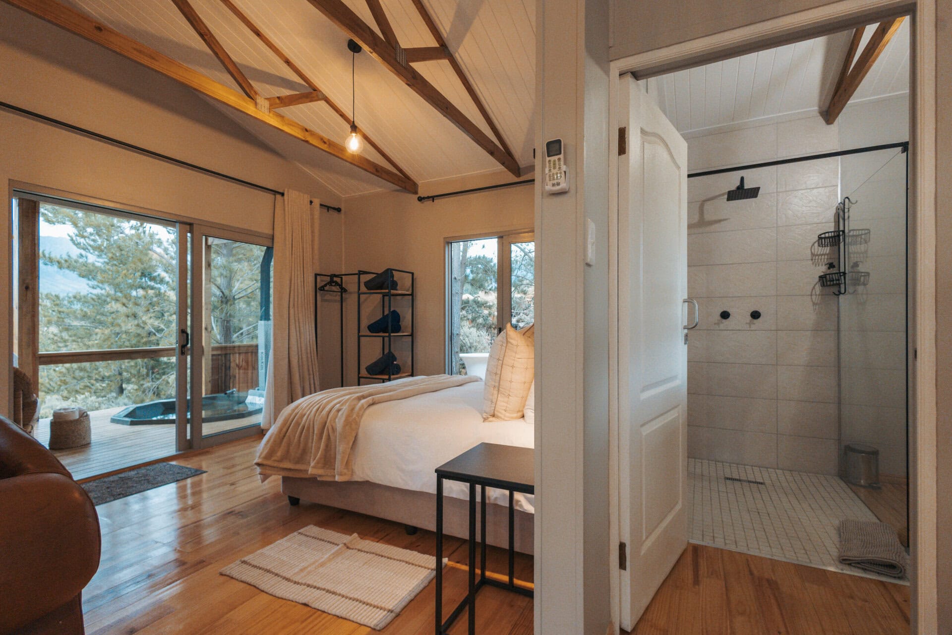 The cabin with it all! Just 90 minutes from Cape Town, it’s the perfect farm escape for two, offering breathtaking mountain views, a cargo net, wood-fired hot tub, sun loungers, an outdoor bath and shower, pizza oven, braai, aircon, TV, high speed wifi, and so many thoughtful touches — ideal for a romantic weekend getaway or working remotely.