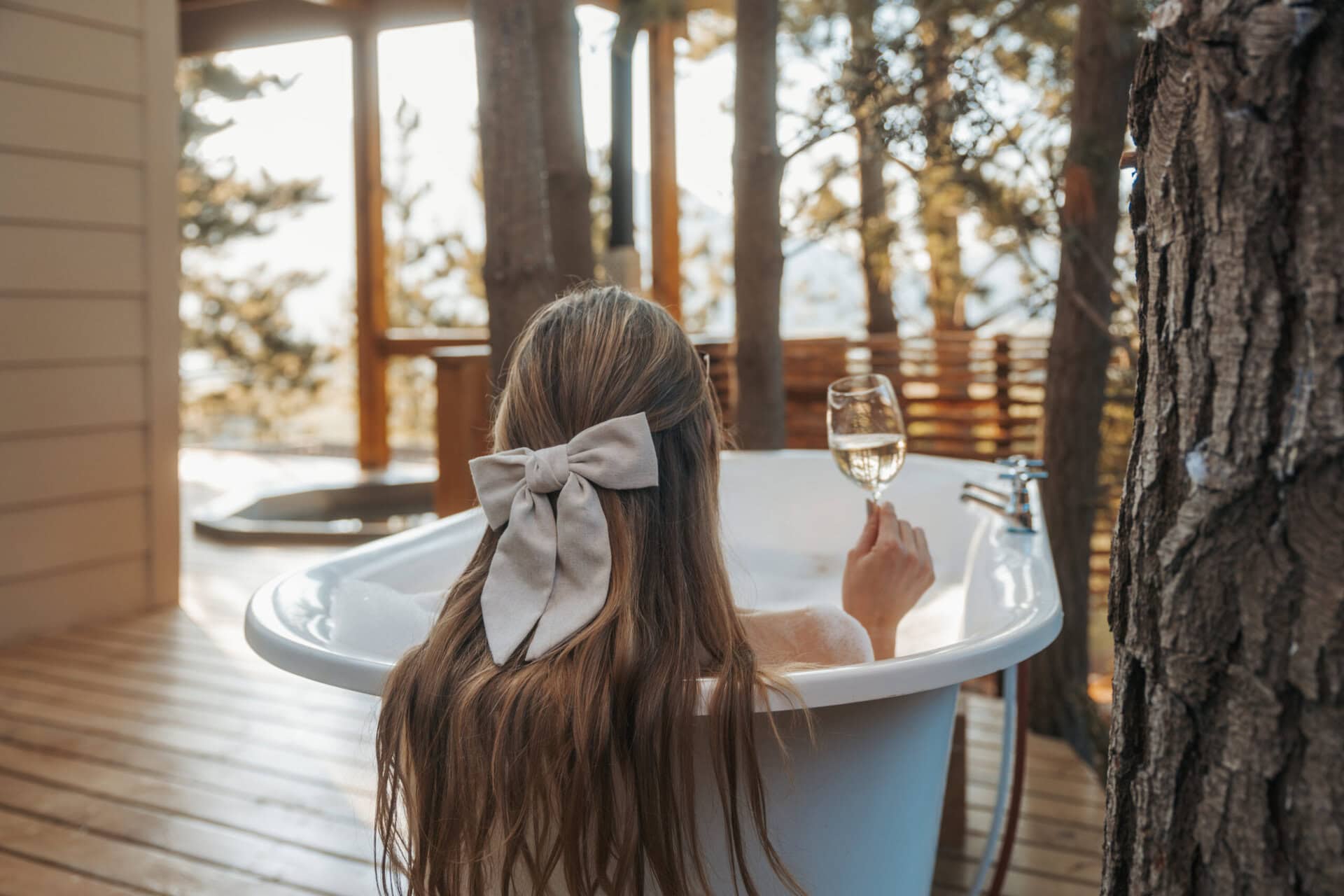 This cabin has such a calming feel with its neutral, earthy tones, and stunning mountain views, perfectly framed by pine trees. We loved listening to the birds chirping while soaking in the outdoor bath and hot tub. And all the small touches and thoughtful amenities make for a super comfy stay!